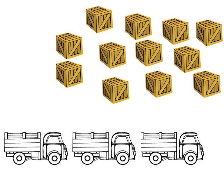 Trois camionneurs doivent livrer douze caisses. Dans chaque camion, ils doivent transporter le même nombre de caisses pour que ce ne soit pas trop lourd.